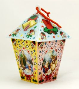 Lampion adwentowy na roraty świecący przy pomocy 3 diod LED, zmieniającymi kolor. Wykonany z plastiku, ze sznureczkiem ułatwiającym noszenie. Wysokość 21 cm, długość boku 13 cm, waga ok. 150 g. Zasilany przy pomocy 3 baterii AA (w zestawie).