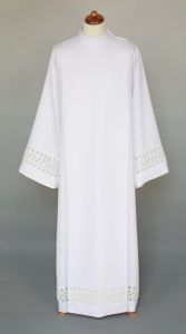Alba kapłańska, krój rzymski, zamek na ramieniu, zdobiona bawełnianą wstawką.Dostępna w rozmiarach: 164, 170, 176, 182, 188, 194. Materiał: stretch.