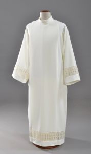 Alba kapłańska w kolorze ecru zdobiona elegancką wstawką.