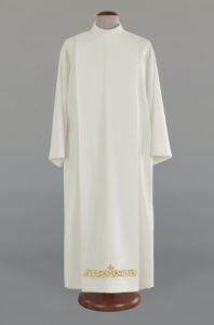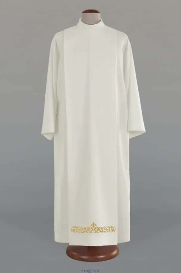 Alba dla kapłana, zdobiona bogatym haftem, zachwyca nie tylko swoim eleganckim designem, ale również wysoką jakością wykonania. Jej krój rzymski z zakładkami oraz bardzo eleganckie zapięcie na ramieniu nadają jej wyjątkowy charakter i sprawiają, że noszący prezentuje się godnie i dostojnie podczas sprawowania liturgii.