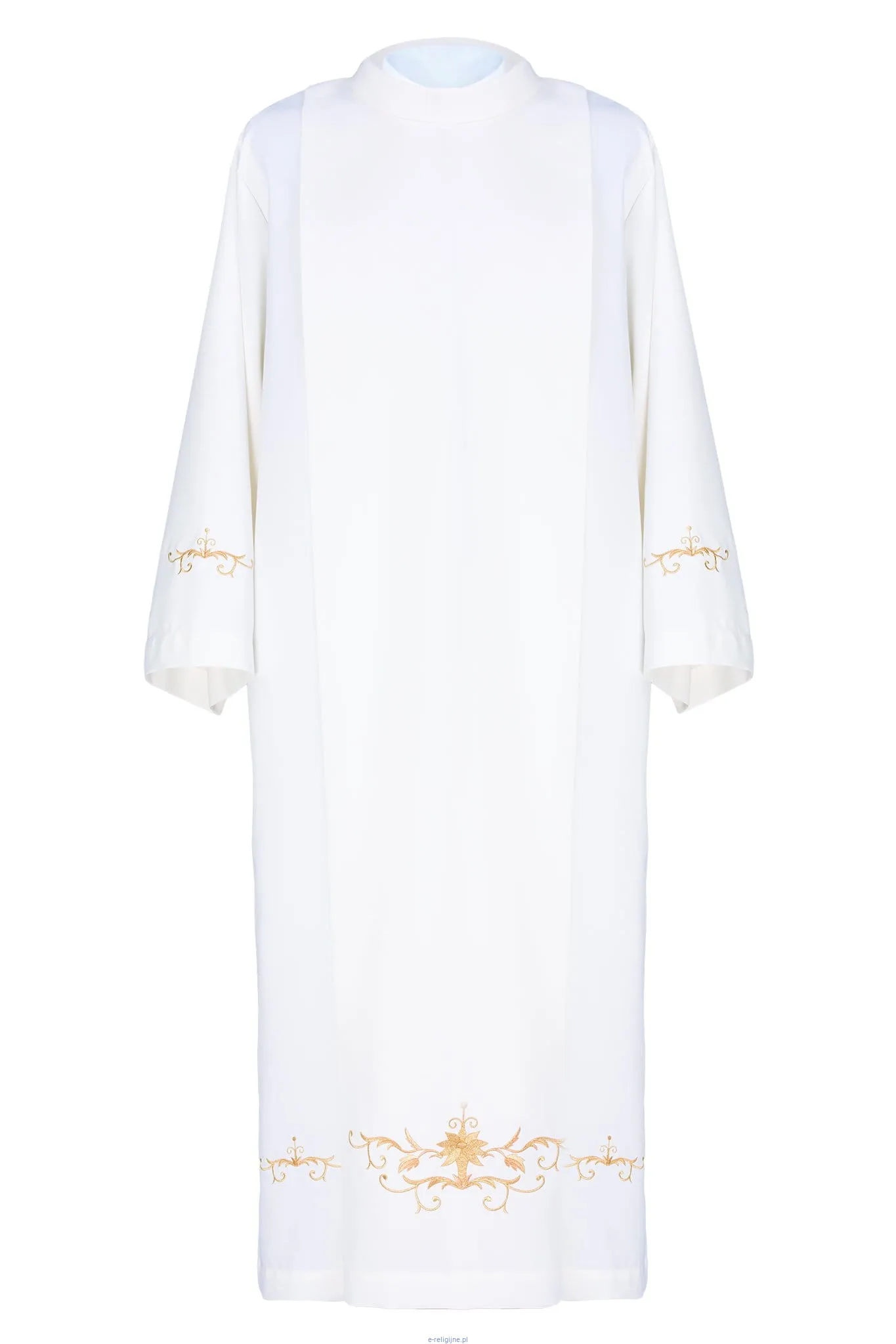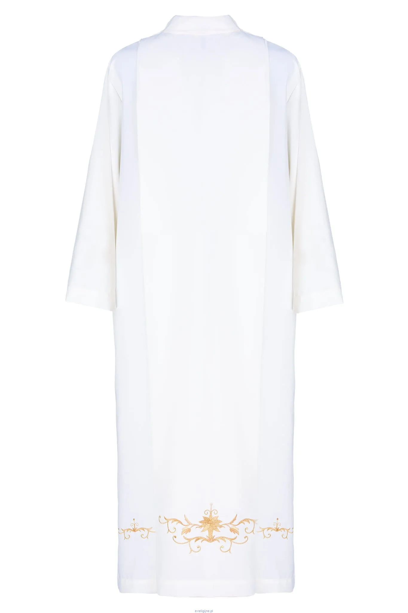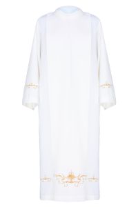 Bogato haftowana złotą nicią alba kapłańska o rzymskim kroju (z zakładkami) wykonana z wysokiej jakości gładkiej tkaniny, z ozdobnym haftem z przodu, tyłu i na rękawach.