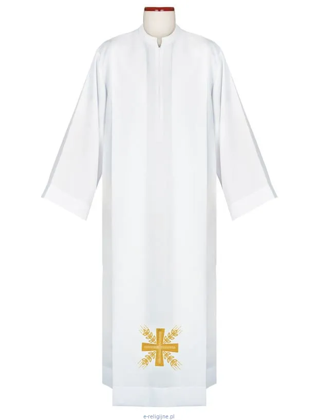 Alba posiada ozdobny, wyszywany złotą nitką haft na dole.