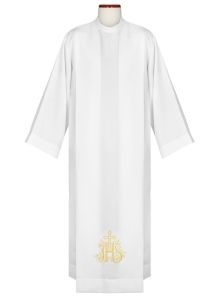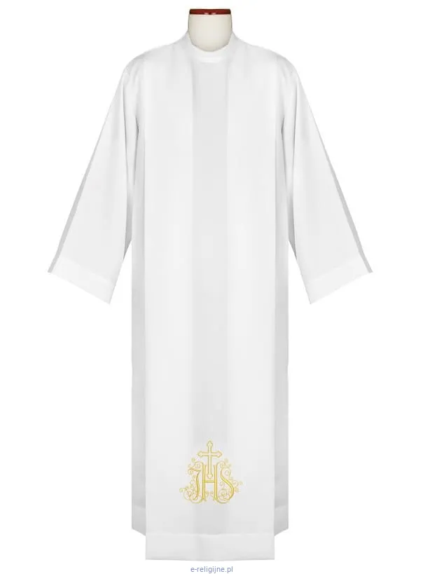 Alba posiada ozdobny, wyszywany złotą nitką haft na dole.