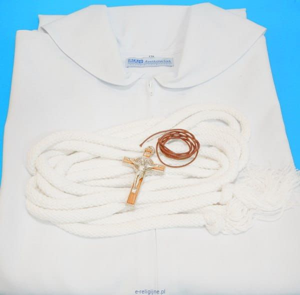 W komplecie również białe cingulum oraz krzyż lektorski - krzyż św. Benedykta posrebrzany ze sznurkiem umożliwiającym założenie na szyję. Wielkość krzyża - 7 cm. Krzyż jest wysokiej jakości produktem włoskim.