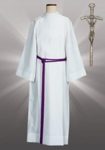 Alba lektorska, wykonana ze stretchu, ze stójką. W zestawie cingulum oraz krzyż lektorski - papieski z rzemykiem. Wielkość krzyża - 11 cm.