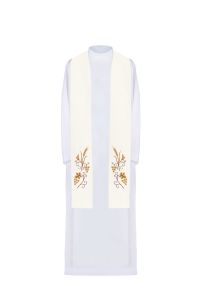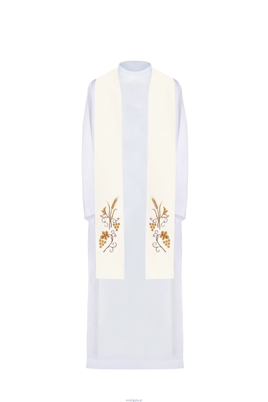 Stuła jednostronna wykonana z wysokiej jakości tkaniny gładkiej, zdobiona bogatym haftem z symbolem winogron i kłosów.