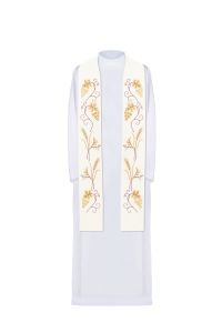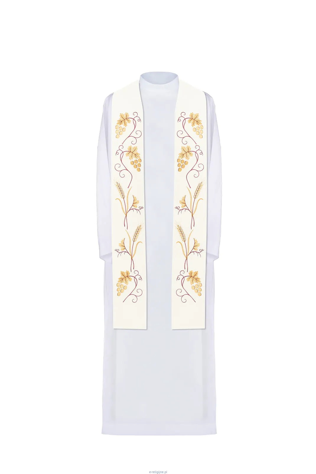 Stuła jednostronna wykonana z wysokiej jakości tkaniny gładkiej, zdobiona bogatym haftem z symbolem winogron i kłosów.