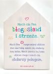 Deska pokryta farbą oraz nadrukowanym cytatem biblijnym.