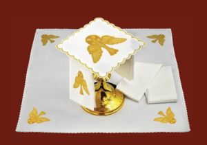 Komplet eleganckiej bielizny ołtarzowej polskiej produkcji. Motyw Ducha Świętego wyhaftowany na poszczególnych elementach kompletu - idealny na Uroczystość Zesłania Ducha Świętego lub bierzmowanie.