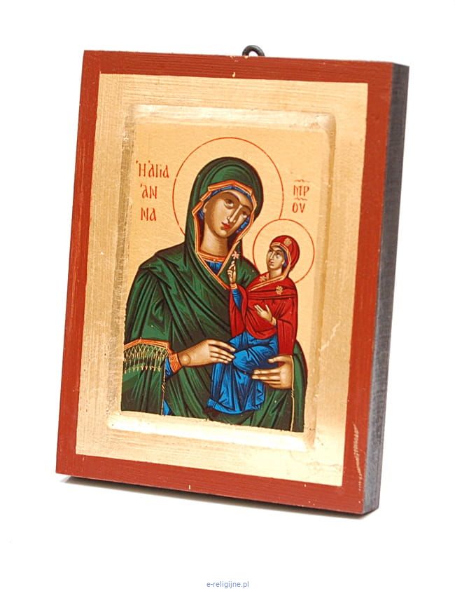 Ikona św. Anny przygotowana jest zarówno do powieszenia na ścianie jak również do postawienia (posiada odpowiednią podpórkę).