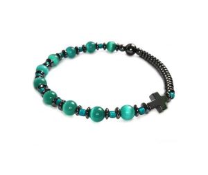Praktyczny, prosty i delikatny różaniec na rękę wykonany ręcznie z kociego oka w kolorze morskiej, turkusowej zieleni, drobnych koralików toho, oraz z kamieni hematytu w kolorze antracytowym.