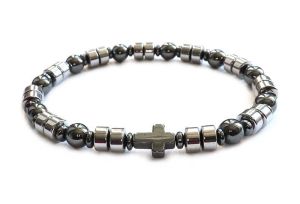 Elegancka bransoletka męska różaniec, wykonana z hematytu w kolorach srebrnym i antracytowym. Idealna dla mężczyzn ceniących oryginalność i wiarę.