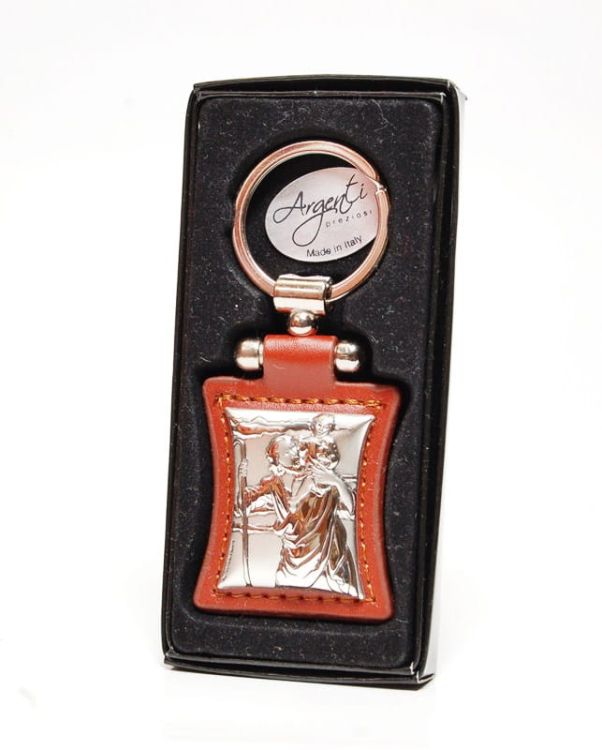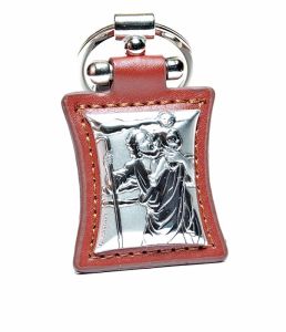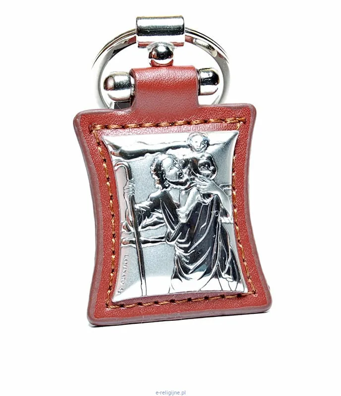 Brelok do kluczy z wizerunkiem św. Krzysztofa. Obrazek laminowany srebrem umieszczony na skórzanym pasku o wymiarach 4,5 cm x 4 cm. Elegancko zapakowany w estetyczne pudełeczko, może stać się doskonałym pomysłem na upominek dla kierowcy.
