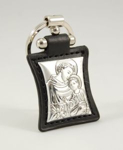 Brelok do kluczy z wizerunkiem świętego Antoniego. Obrazek laminowany srebrem umieszczony na skórzanym pasku o wymiarach 4,5 cm x 4 cm. Elegancko zapakowany w estetyczne pudełeczko, może stać się doskonałym pomysłem na upominek dla kierowcy.