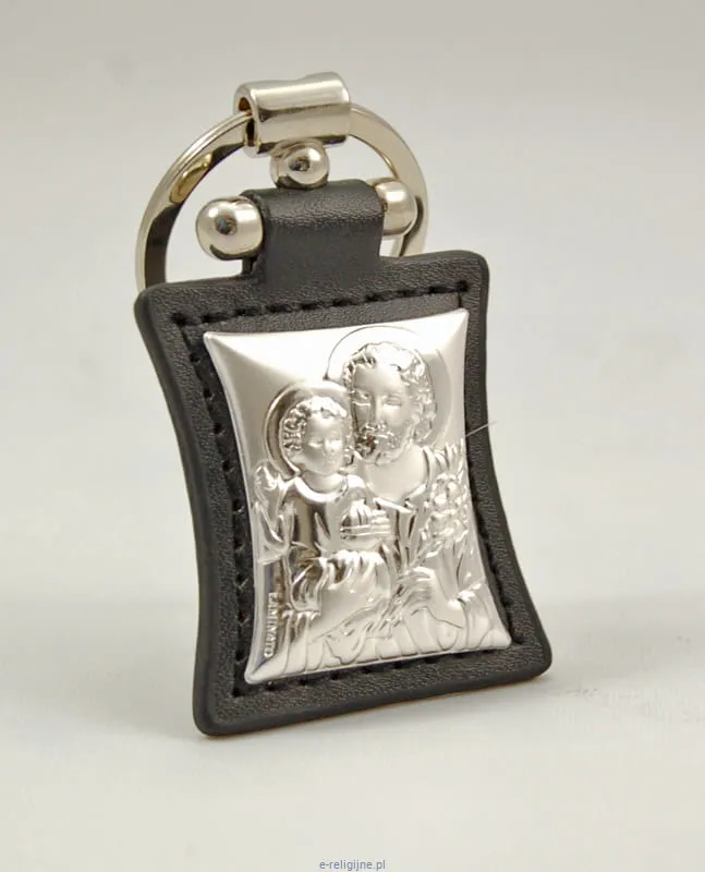 Brelok do kluczy z wizerunkiem świętego Józefa. Obrazek laminowany srebrem umieszczony na skórzanym pasku o wymiarach 4,5 cm x 4 cm. Elegancko zapakowany w estetyczne pudełeczko, może stać się doskonałym pomysłem na upominek dla kierowcy.