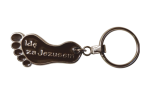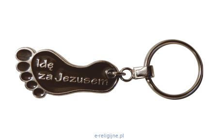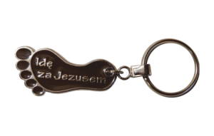 Brelok religijny do kluczy metalowy w kształcie stopy z napisem "Idę za Jezusem" . Na odwrocie wersja angielska napisu "I follow Jesus"