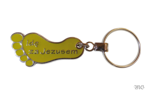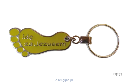 Brelok religijny do kluczy metalowy w kształcie stopy z napisem "Idę za Jezusem" . Wymiary breloka 2 cm x 5 cm.