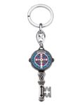 Lekki metalowy brelok do kluczy z medalem św. Benedykta w który wpisany jest krzyż benedyktyński.