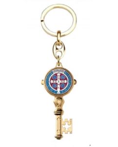 Lekki metalowy brelok do kluczy z medalem św. Benedykta w który wpisany jest krzyż benedyktyński.