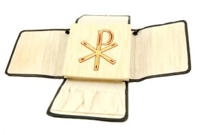 Bursa skórzana na sznurku do zanoszenia Komunii Świętej chorym. Złożona posiada wymiary 15 cm x 15 cm. Wewnątrz bogato haftowana kieszeń na cyborium oraz w dolnej części kieszonka na puryfikaterz, oleje.
