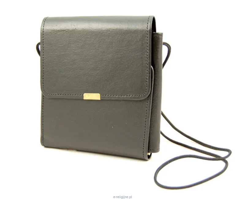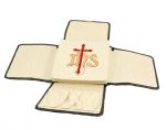Bursa skórzana na sznurku do zanoszenia Komunii Świętej chorym. Złożona posiada wymiary 15 cm x 15 cm. Wewnątrz bogato haftowana kieszeń na cyborium oraz w dolnej części kieszonka na puryfikaterz, oleje.