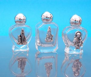 Butelka do przechowywania wody święconej.Ozdobiona wizerunkami Matki Bożej lub Świętej Rodziny.
