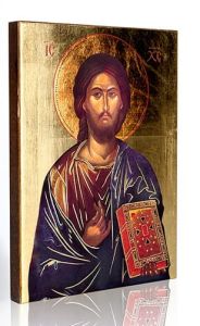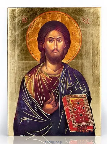 Ikona przedstawiająca Pana Jezusa - Chrystus Pantokrator. Przepiękna, ręcznie robiona, kolorowa, wykonana na desce olchowej, ręcznie złocona złotem płatkowym.