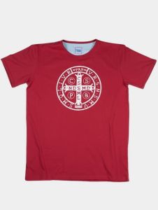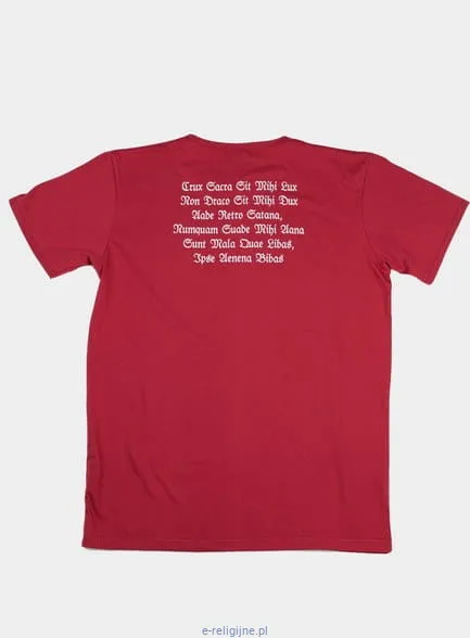 Wygodna i estetyczna, z nadrukiem z przodu (krzyż św. Benedykta) oraz na plecach (modlitwa w języku łacińskim: Krzyż święty niech mi będzie światłem / Idź precz szatanie, nie kuś mnie do próżności. Złe jest to co podsuwasz, sam pij truciznę) . Nadruk na koszulce został wykonany metodą sitodruku.