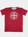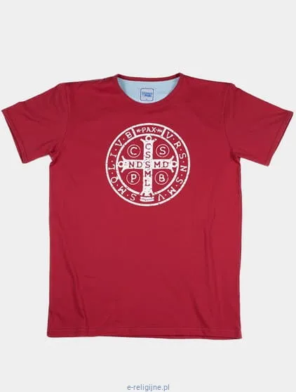 Chrześcijańska koszulka z krótkim rękawem w kolorze bordowym z krzyżem św. Benedykta.