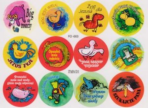 Na naklejkach w kształcie koła radosne, pełne humoru rysunki o charakterze religijnym z różnymi cytatami, jak np. Żyję dla Jezusa, Wspominam dzieła Pana, Bóg jest wielki, Błogosławię Pana mojego.