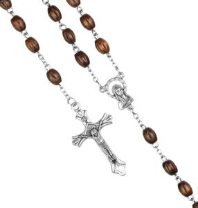 Różaniec R1231 to różaniec drewniany z paciorkami o średnicy 6 mm i metalowym krzyżykiem.