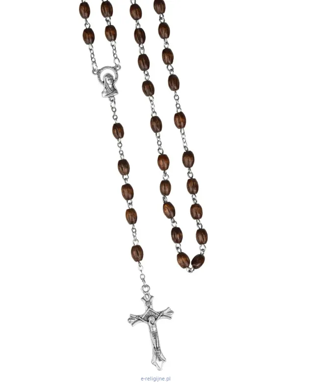 Czy ten różaniec nadaje się na prezent komunijny dla dziecka? Nie w typowym rozumieniu. Na Pierwszą Komunię wybiera się różańce w jaśniejszej kolorystyce (biały, kremowy, jasnoróżowy), często perłowe albo kryształowe, pakowane w dedykowane pudełko z miejscem na dedykację. Ciemny różaniec drewniany w segmencie cenowym do 20 zł nie spełnia konwencji pamiątkowej. Dedykowane różańce komunijne dostępne są w osobnej kategorii.