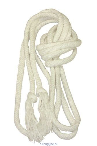 Cingulum bawełniane białe (długość 4 m) to liturgiczny pasek do przepasywania alby — gruby, pleciony sznur z czystej bawełny zakończony frędzlami na obu końcach, zgodny z wymogiem OWMR nr 336.