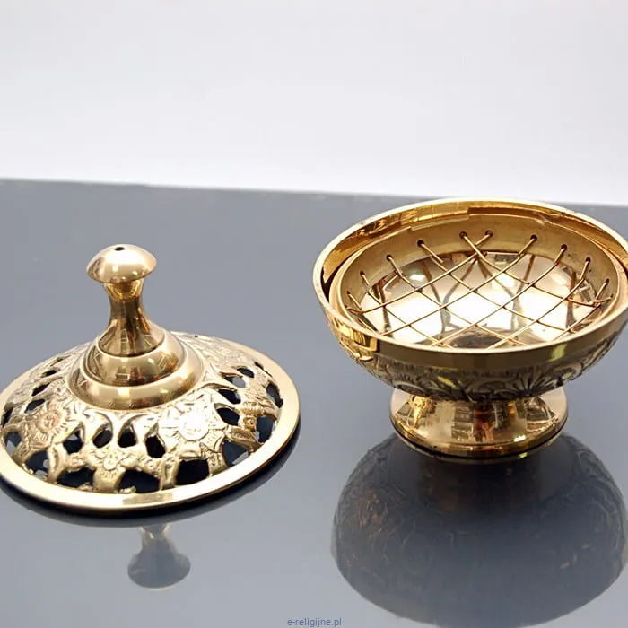 Elegancka mosiężna kadzielnica domowa łączy w sobie kunszt tradycyjnego rzemiosła z praktycznością codziennego użytku. Wykonane zdobienia roślinne na korpusie oraz misterna, ażurowa pokrywa tworzą harmonijną całość, która zachwyca każdym detalem.