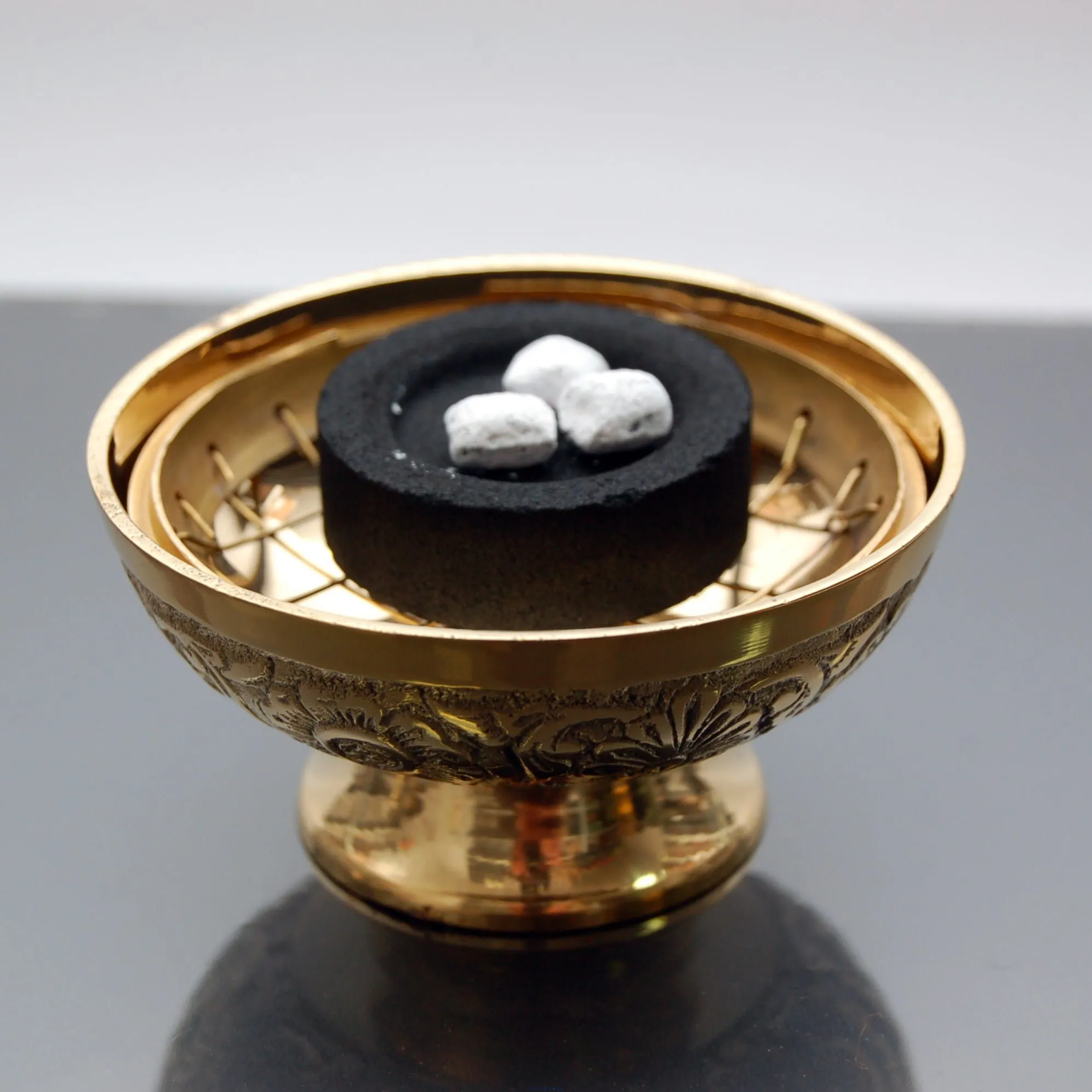 Mosiężna kadzielnica na węgielek o średnicy 6 cm i wysokości 4 cm. W kadzielnicy, na odwróconej kratce, umieszcza się węgielek, który po rozpaleniu zasypuje się kadzidłem: ziołowym, żywicznym lub proszkowym.