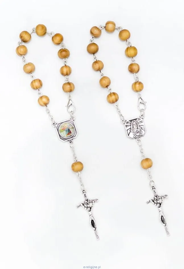 Różaniec z drewna na metalowym łańcuszku, z metalowym krzyżykiem i łącznikiem. Idealnie nadaje się do samochodu, jako podręczny różaniec dla kierowcy.