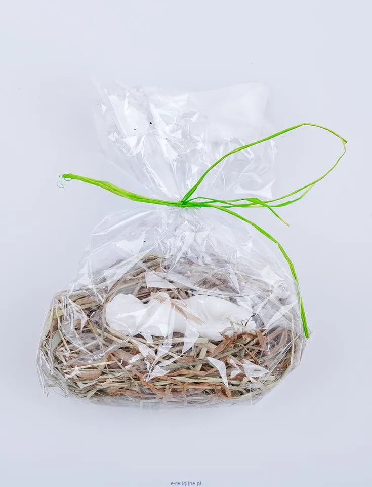 Alabastrowa figurka Dzieciątka Jezus na sianku, zapakowana w foliowy papier pakowy.
