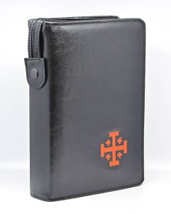 Okładka na Biblię Jerozolimską w kolorze czarnym z wyhaftowanym krzyżem Jerozolimskim.