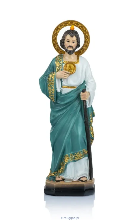 Figurka Świętego Judy Tadeusza to rzeźba z żywicy z wypełniaczem mineralnym o wysokości 22 cm. Malowana ręcznie — biała szata, turkusowy płaszcz, złocenia na aureoli i krawędziach.