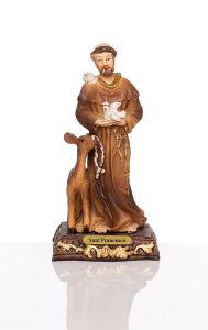 Niewielkich rozmiarów figurka św. Franciszka z Asyżu wykonana z masy żywicznej.