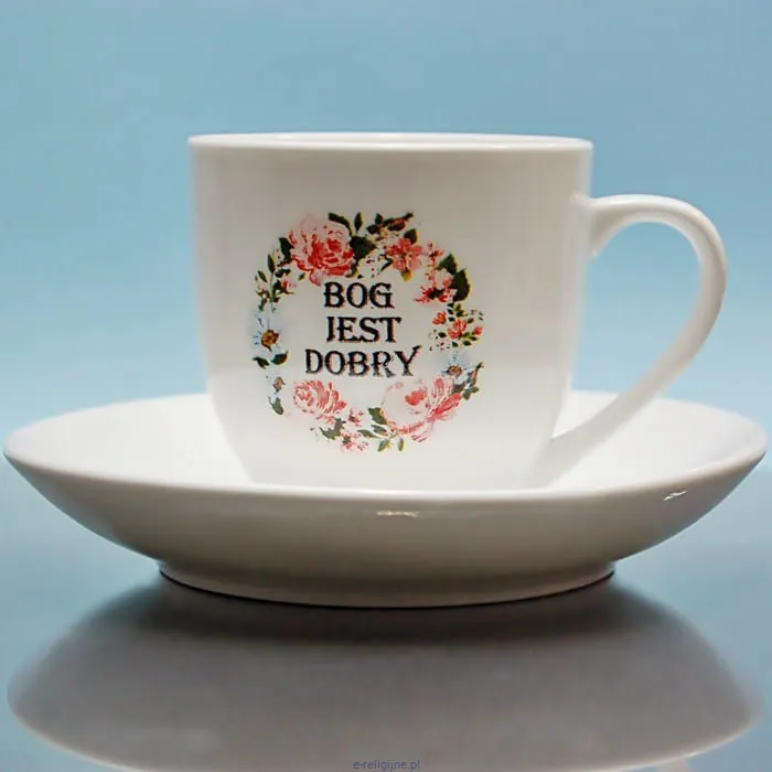 Filiżanka ze spodkiem z religijnym cytatem: "Bóg jest dobry"