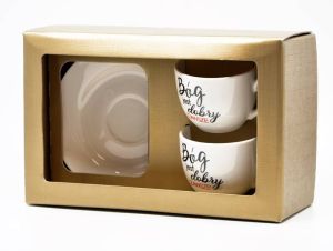 Ceramiczny zestaw dwóch filiżanek ze spodeczkami z napisem "Bóg jest dobry zawsze" a także z estetyczną grafiką.