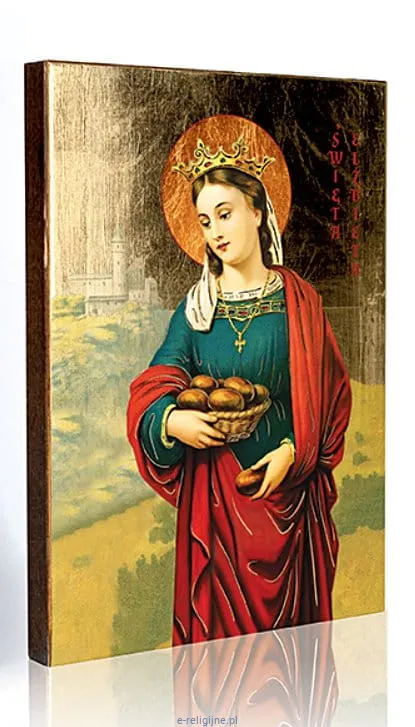 Ikona święta Elżbieta. Przedstawiana w stroju królewskim i z chlebem w dłoni - pełna wzgardy dla ziemskich bogactw oraz wrażliwości wobec ubogich. Najbiedniejszych i odrażających sadzała do swego stołu.