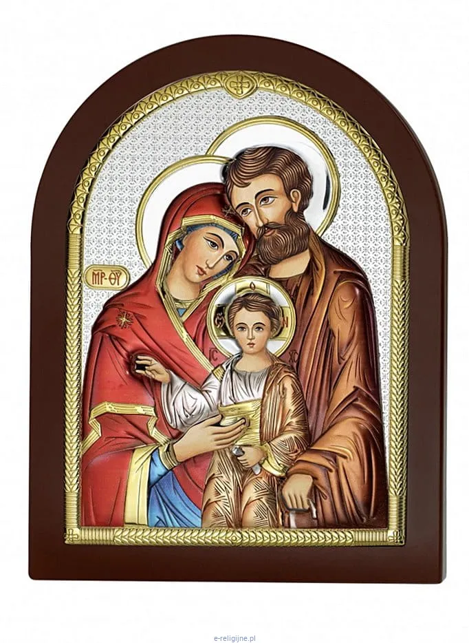 Ikona Świętej Rodziny laminowana srebrem osadzona w lakierowanej drewnianej ramie o wymiarach 9,5 x 12,5 cm