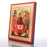 Ikona Trójcy Świętej Rublowa. Wysokość 31 cm, szerokość, 25 cm, grubość 1,6 cm. Z tyłu ikony otwór umożliwiający zawieszenie. Ikona pakowana w estetyczne kartonowe pudełko.