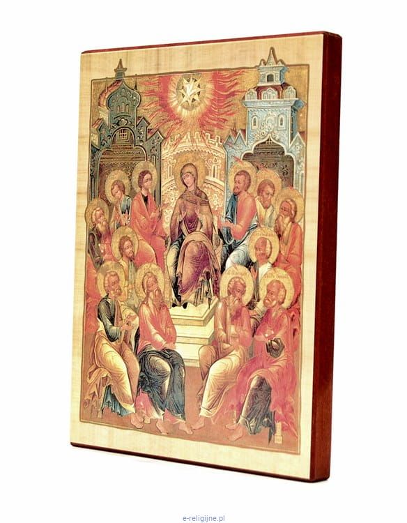 Ikona reprodukcja rosyjskiej ikony z XIX w. z przedstawieniem Zesłania Ducha św. Reprodukcja wysokiej jakości wykonana na płycie drewnopodobnej. Rozmiar 15 cm x 20 cm. Grubość deski 1,5 cm. Możliwość powieszenia na ścianie.