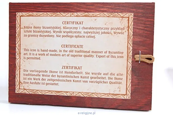 Wysokość ikony 13,5 cm, szerokość 9,5 cm. Możliwość powieszenia na ścianie. Opatrzona certyfikatem. Kraj pochodzenia: Grecja.