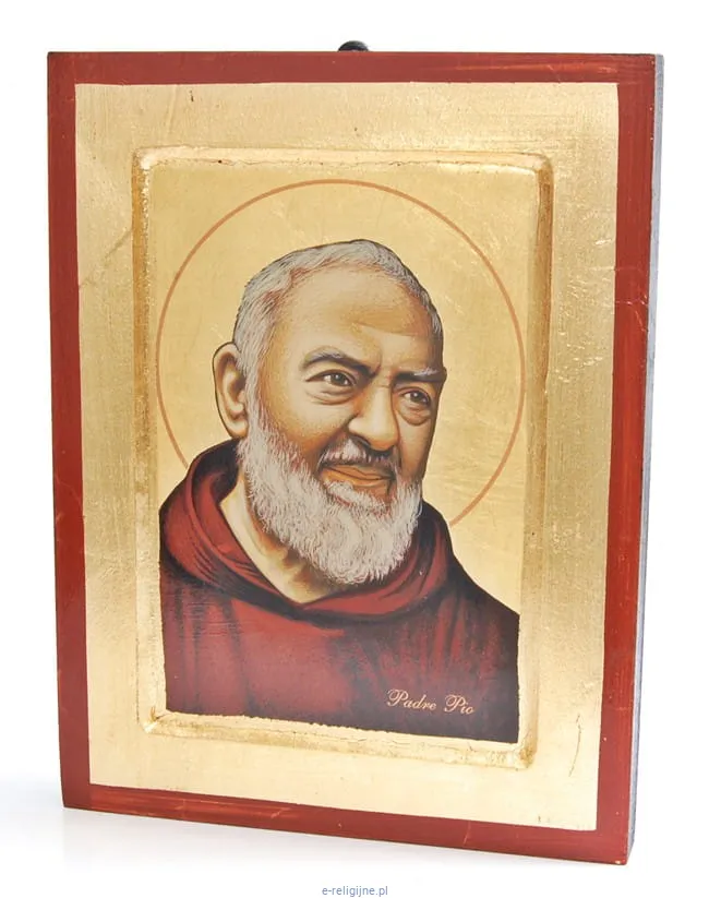 Bizantyjska ikona z wizerunkiem św. o. Pio. Wykonana na drewnianej desce o grubości 2,5 cm. Posiada certyfikat autentyczności ręcznego wykonania.