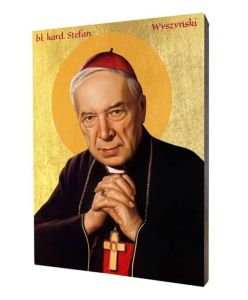 Ikona błogosławionego kardynała Stefana Wyszyńskiego wykonana na desce lipowej podwójnie gruntowanej oraz uszlachetnionej płatkami pozłoty. Wizerunek został naniesiony przy użyciu specjalnej techniki druku bezpośrednio na deskę.