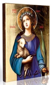 Ikona św. Agnieszki wykonana na olchowej desce - złocona płatkami złota.